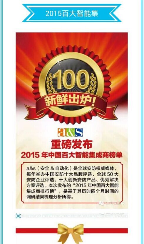 由安全&自動化雜志承辦,工信部下屬中國電子學(xué)會信息系統(tǒng)集成分會主辦的第一屆百大智慧安防集成商評選活動,吸引了來自智能化產(chǎn)業(yè)的超過200位高端嘉賓參會,包括政府部門、國內(nèi)外知名智能化企業(yè)以及智能化產(chǎn)業(yè)的專家、學(xué)者、企業(yè)高管、技術(shù)總監(jiān)等,經(jīng)過長達4個月的角逐,我公司從評選活動的6萬名智能集成商中脫穎而出,獲得“2015中國百大智能集成企業(yè)”的榮譽 。a&s(安全&自動化)是全球安防權(quán)威媒體,每年舉辦全國安防十大品牌評選、全球50大安防品牌評選、十大創(chuàng)新安防產(chǎn)品、優(yōu)秀解決方案評選。本次發(fā)布的“2015年中國百大集成商排行榜”是經(jīng)過四個月調(diào)研結(jié)果梳理分析所得。