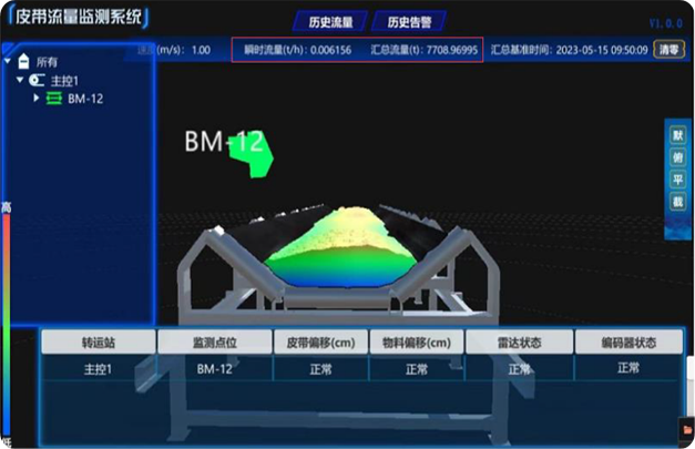傳送皮帶流量監(jiān)測(cè)系統(tǒng)采用高頻紅外激光雷達(dá)掃描及智能算法相結(jié)合的技 術(shù)方案,實(shí)現(xiàn)皮帶運(yùn)輸流量的實(shí)時(shí)監(jiān)測(cè)及累計(jì)流量監(jiān)測(cè),皮帶跑偏檢測(cè)、報(bào)警及 轉(zhuǎn)運(yùn)站卡堵預(yù)警等功能。